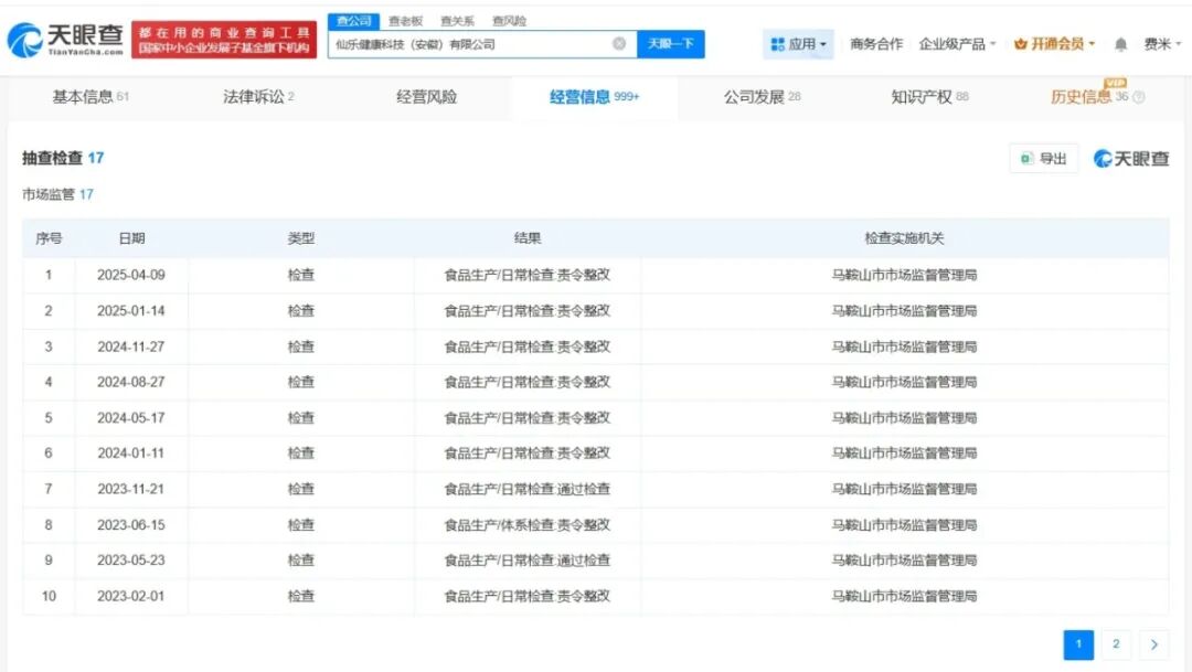 天眼查App显示,涉事公司仙乐健康科技(安徽)有限公司成立于2013年11月,法定代表人为黄舒丽,注册资本1亿人民币,经营范围包括食品生产、销售,保健食品生产、销售,食品添加剂的生产等,由仙乐健康(300791)全资持股。抽查检查信息显示,该公司曾多次出现责令整改的情形。