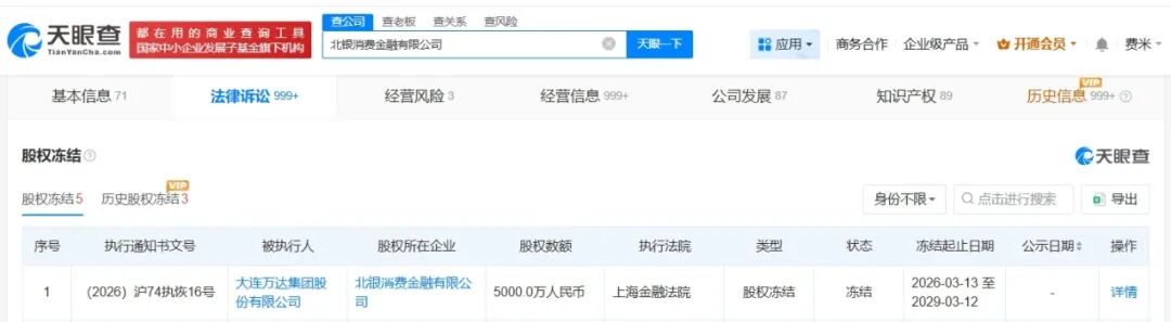 天眼查App显示,北银消费金融有限公司新增一则股权冻结信息,被执行人为大连万达集团股份有限公司,冻结股权数额5000万元,冻结期限为3年,执行法院为上海金融法院。