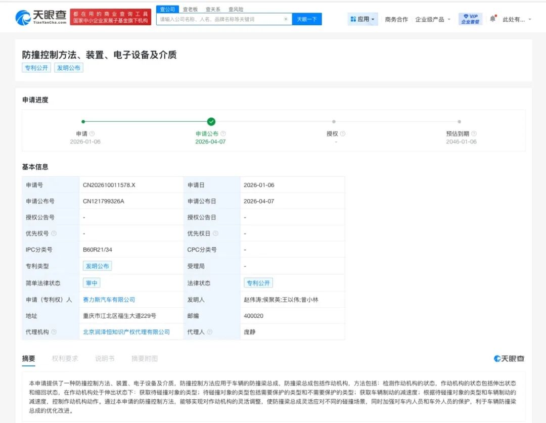 天眼查知识产权信息显示,近日,赛力斯汽车有限公司申请的“防撞控制方法、装置、电子设备及介质”专利公布。