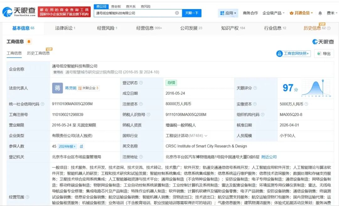 该公司成立于2016年5月,法定代表人为蒋灵明,经营范围包括轨道交通通信信号系统开发、人工智能应用软件开发、通用航空服务等,由中国通号(688009)全资持股。
