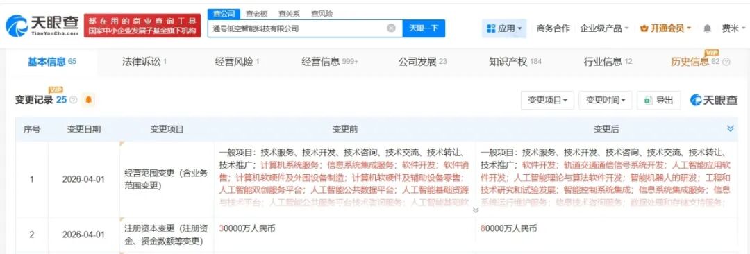 天眼查App显示,近日,通号低空智能科技有限公司发生工商变更,注册资本由3亿人民币增至8亿人民币,增幅约167%。