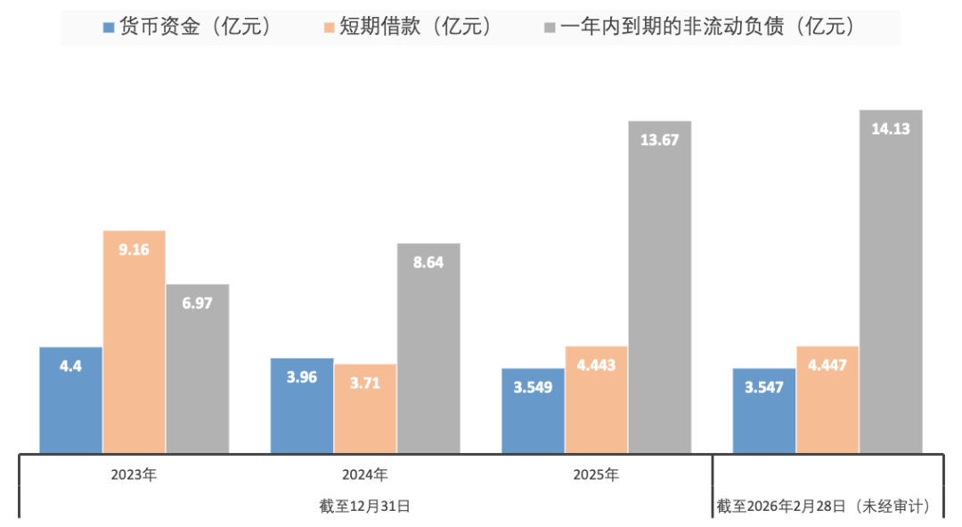 数据披露,2025年,新乳业经营活动产生的现金流量净额仅同比微增1.26%至15.10亿元,尚不及2023年同期数值(15.57亿元)。公司的货币资金也持续下滑,截至2025年末已降至3.549亿元,较2023年末减少超八千万元;截至2026年2月28日(未经审计),货币资金进一步缩减至3.547亿元。