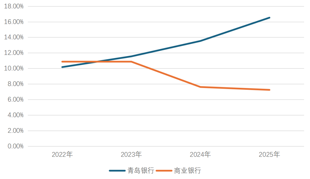 据青岛银行2025年年报,当年末,该行客户贷款总额同比增长16.53%,远超同期商业银行贷款同比增速7.24%。其中,公司贷款同比增长22.49%。