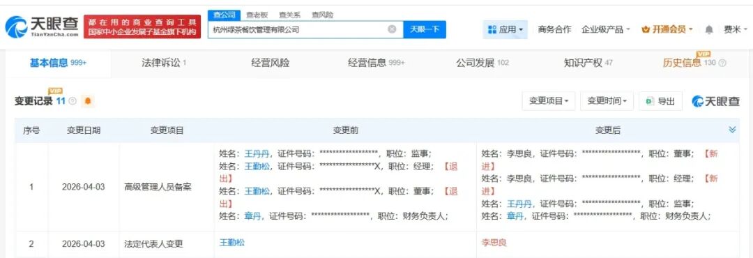 绿茶餐厅关联公司杭州绿茶餐饮管理有限公司发生工商变更,创始人王勤松卸任法定代表人、董事、经理,由李思良接任