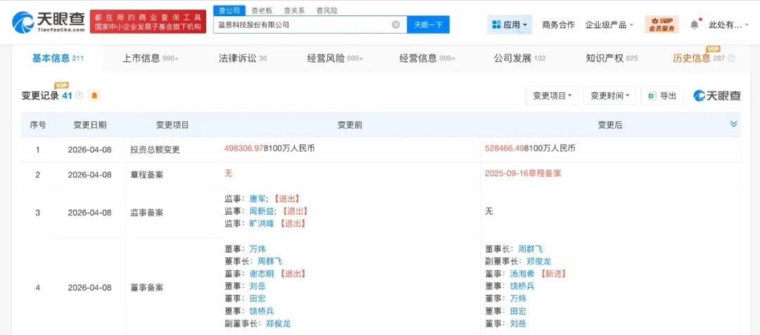 天眼查工商信息显示,近日,蓝思科技股份有限公司发生工商变更,注册资本由约49.8亿人民币增至约52.8亿人民币,增幅约6%。