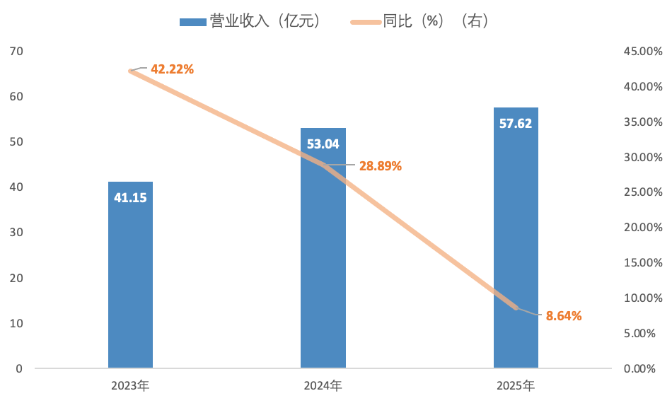 近日,休闲零食龙头企业盐津铺子食品股份有限公司(下称盐津铺子,002847.SZ)披露最新年报。数据显示,2025年公司业绩延续稳增态势,营业收入同比增长8.64%至57.62亿元,归母净利润同比增长16.95%至7.48亿元。