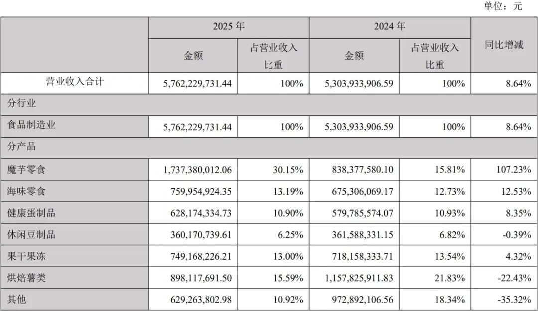 2025年,盐津铺子的收入结构发生变化。魔芋零食收入同比大幅增长107.23%,达到17.37亿元,占公司全年总营收的30.15%,新晋成为盐津铺子全年第一大产品收入来源。同年,烘焙薯类收入同比下降22.43%至8.98亿元,收入占比也下滑至15.59%。