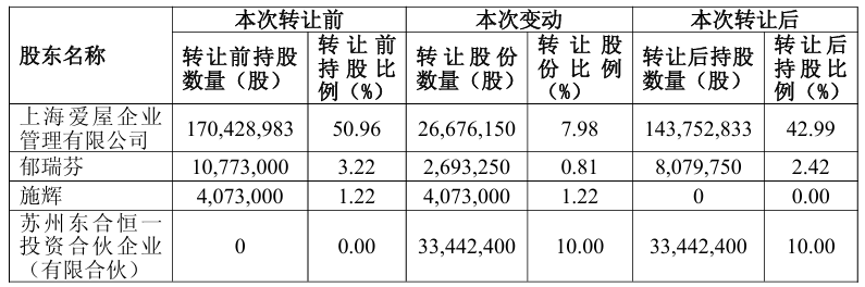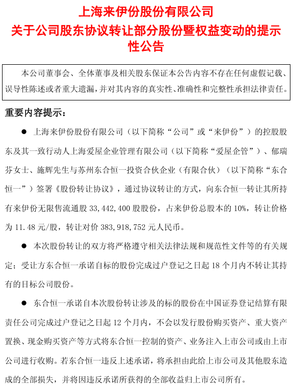 公告内容显示,来伊份控股股东及其一致行动人——上海爱屋企业管理有限公司、郁瑞芬、施辉,与苏州东合恒一投资合伙企业(有限合伙)(下称东合恒一)正式签署《股份转让协议》,计划通过协议转让的方式,向东合恒一转让3344.24万股公司无限售流通股,转让股份数量占公司总股本的10%。本次转让的总对价约为3.84亿元,转让价格为11.48元/股,较公告当日公司股票收盘价折价约18.18%。