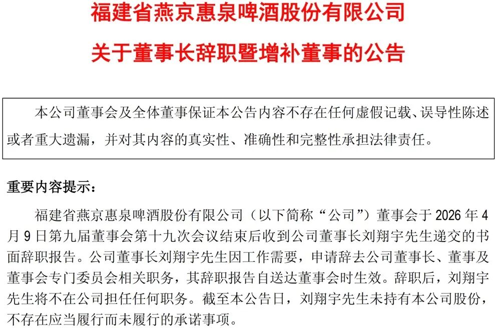 2026年4月12日,惠泉啤酒发布公告称,公司于4月9日收到董事长刘翔宇递交的书面辞职报告,因工作需要,刘翔宇申请辞去公司董事长、董事及董事会专门委员会相关职务。辞职后,刘翔宇将退出惠泉啤酒管理层。