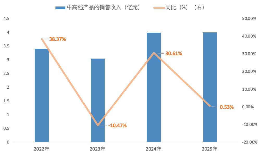 从2022年至2025年情况来看。2022年,惠泉啤酒中高档酒销量、销售收入同比分别增长54.05%和38.37%;次年,该档次产品销量增幅放缓至0.10%,其销售收入也由增转减,同比下滑10.47%。2024年,公司中高档酒的销量、销售收入重回两位数增长态势,但到了2025年,该档次产品销量、销售收入增幅再度大幅放缓,分别仅增0.20%和0.53%。