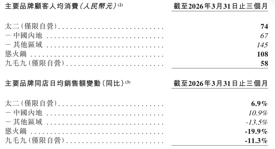 2026年第一季度,太二其他区域的同店日均销售额有所承压,同比下滑13.5%。九毛九在公告中解释称,主要受到顾客人均消费因菜品结构调整等因素出现小幅下降,以及部分境外地区外部市场环境变化带来的影响。