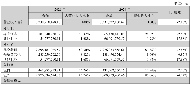 作为一家外向型企业,哈尔斯营收长期以境外市场为主力。年报数据显示,近两年,其境外收入占比均超过85%,对海外市场依赖度较高。也正因如此,当境外收入增速显著下滑,由2024年的46.78%转为2025年的-4.27%,公司整体业绩就难免受到影响。