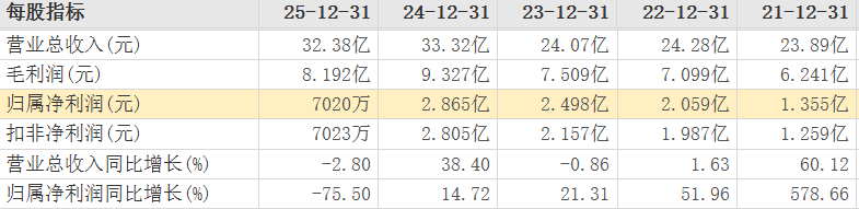 2024年业绩刚创下新高的哈尔斯(002615.SZ),却在2025年交出了近五年最差成绩单。年报数据显示,公司全年实现营收32.38亿元,同比微降2.8%,而归母净利润则骤降至7020.29万元,同比减少75.5%,仅为2021年盈利规模的五成水平。
