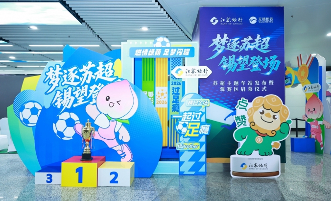 2026年“苏超”开幕当日,“邪恶水蜜桃”无锡队坐阵主场取胜并揽获本赛季首粒进球。江苏银行无锡分行携手无锡地铁集团共同打造的“苏超”地铁主题车站也于当日在地处无锡城市核心生活消费圈的三阳广场站正式亮相。该主题车站以“苏超”赛事文化为核心,致力于打造集浓厚体育氛围、鲜明城市特色与优质观赛体验于一体的城市文化新地标。同时,主题列车、江苏银行文创地铁卡同步推出,以足球文化赋能城市公共空间,深化“金融+体育+交通”跨界融合。