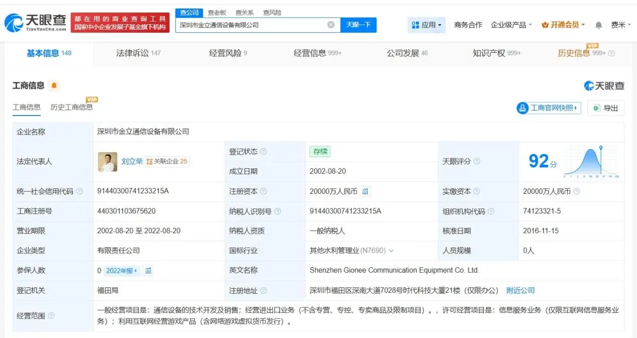 金立手机关联公司深圳市金立通信设备有限公司成立于2002年8月,法定代表人为刘立荣,注册资本2亿人民币,经营范围包括通信设备的技术开发及销售、经营进出口业务、信息服务业务等,由刘立荣、卢光辉、李金荣等共同持股。