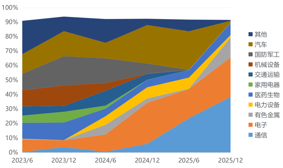 从东方红睿丰混合基金的行业结构来看,相比2023年接管时,刘辉将组合往通信、电子、有色金属等方向倾斜,同时减少了在汽车、国防军工、机械设备等行业的配置。