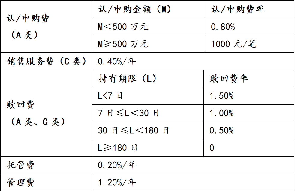 上表认购费及申购费适用于投资者通过其他销售机构认购、申购本基金A类基金份额。通过直销机构认购、申购本基金A类基金份额的不收取认购费、申购费。C类基金份额不收取认购费、申购费。对于投资者通过直销机构认购/申购/转换转入的C类基金份额计提的销售服务费,或者通过其他销售机构认购/申购/转换转入且持续持有期限超过一年的C类基金份额在持有超过一年后继续计提的销售服务费,将在投资者赎回、转换转出相应基金份额或基金合同终止时随赎回款(或转出款或清算款)一并返还给投资者。