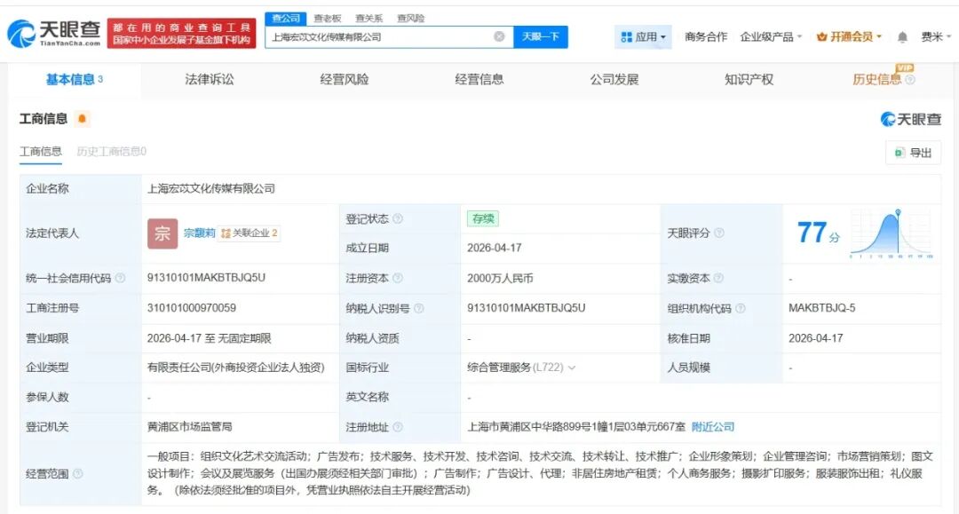 今年以来已成立上海宏苡文化传媒有限公司、上海宏璇商业管理有限公司、上海宏芊企业管理有限公司、杭州凯辰文化传媒有限公司