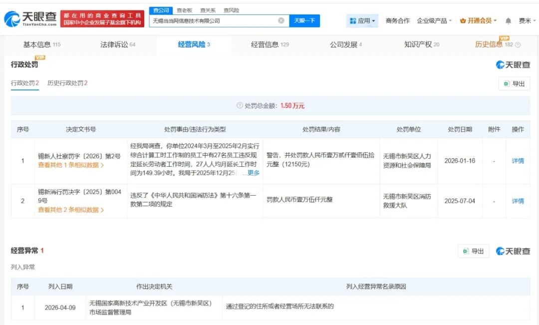 天眼查经营风险信息显示,近日,无锡当当网信息技术有限公司因通过登记的住所或者经营场所无法联系,被无锡国家高新技术产业开发区(无锡市新吴区)市场监督管理局列入经营异常名录。