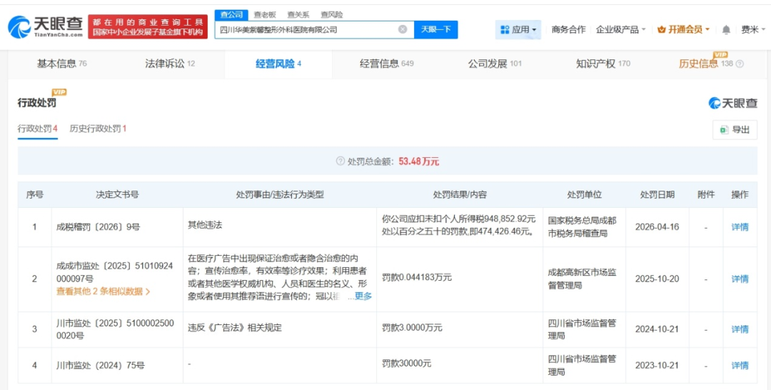 天眼查经营风险信息显示,近日,四川华美紫馨整形外科医院有限公司因应扣未扣个人所得税94万余元,被国家税务总局成都市税务局稽查局罚款47万余元。