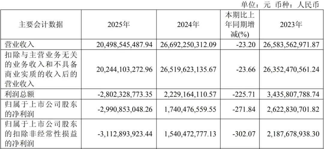 数据显示,2025年,合盛硅业股份有限公司(下称合盛硅业,603260.SH)所处行业整体处于调整阶段,公司业绩经营因此受到不小冲击,全年营收同比下降23.20%至204.99亿元,归母净利润较上年同期大幅下滑271.84%,由盈转亏录得-29.91亿元,扣除非经常性损益后的净利润则同比降超300%,为-31.13亿元。