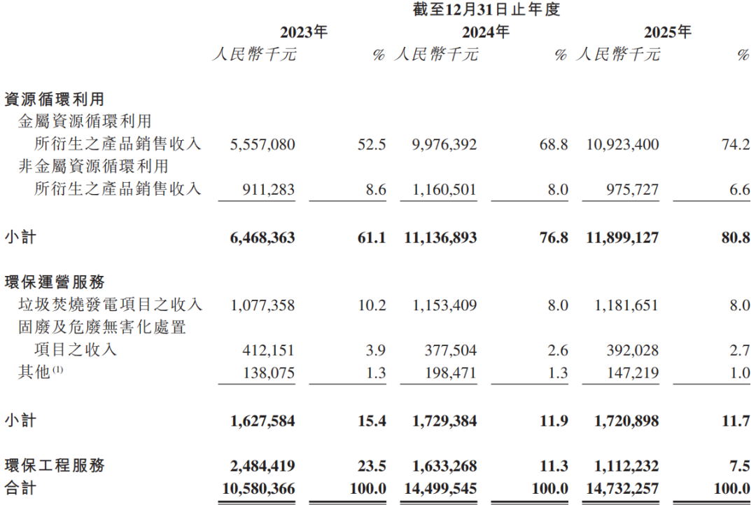 投资时间网、标点财经研究员留意到,出现前述情况或源于高能环境业务结构的重塑。过去,环保工程服务是公司营收主力,如今,高能环境正在主动收缩该项业务,收入占比从2023年的23.5%断崖式下滑至2025年的7.5%。取而代之的是资源循环利用业务的爆发,收入占比从61.1%猛增至80.8%。