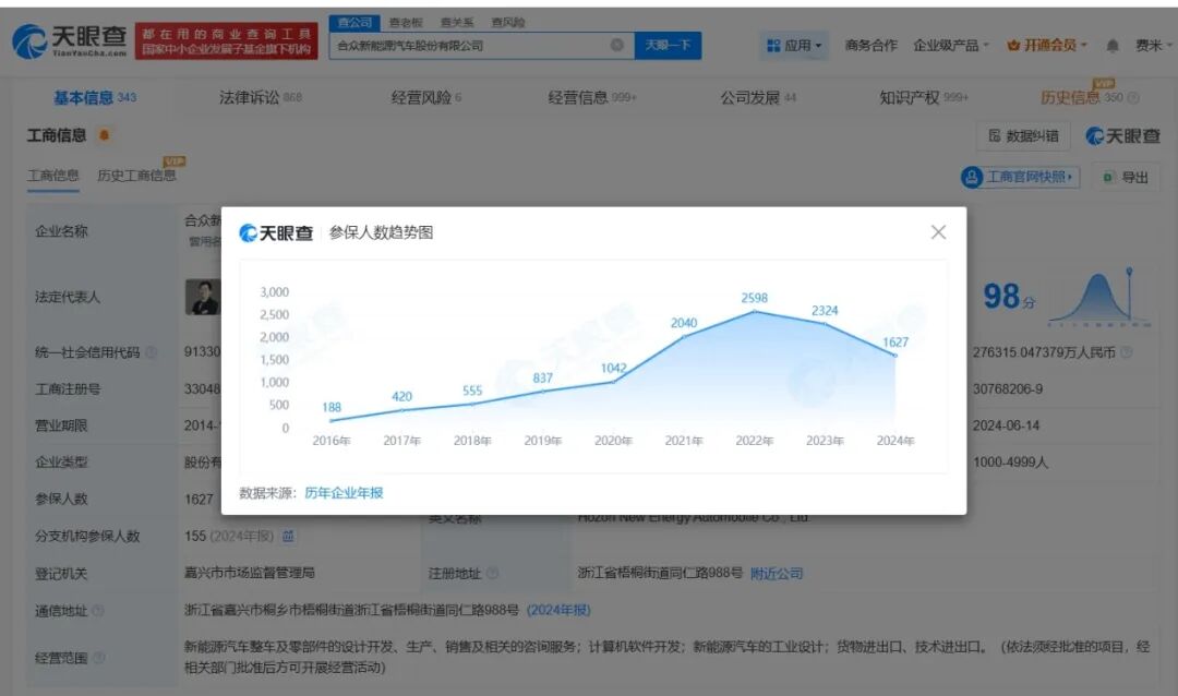 参保人数信息显示,该公司从2022年的2598人降至2024年的1627人。