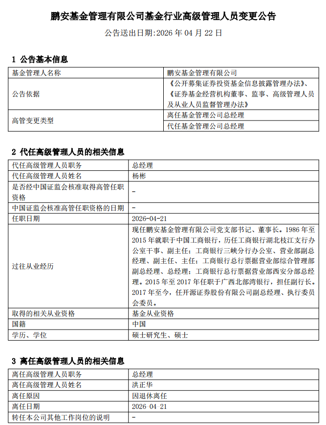 4月22日,鹏安基金发布高级管理人员变更公告称,总经理洪正华因退休离任,由董事长杨彬代任总经理。变更日期为2026年4月21日。