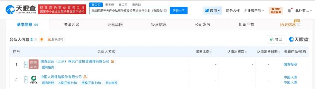 天眼查App显示,近日,重庆国寿养老产业私募股权投资基金合伙企业(有限合伙)成立,执行事务合伙人为国寿启远(北京)养老产业投资管理有限公司,出资额85亿人民币,经营范围为以私募基金从事股权投资、投资管理、资产管理等活动。合伙人信息显示,该基金由中国人寿(601628)、国寿启远(北京)养老产业投资管理有限公司共同出资。