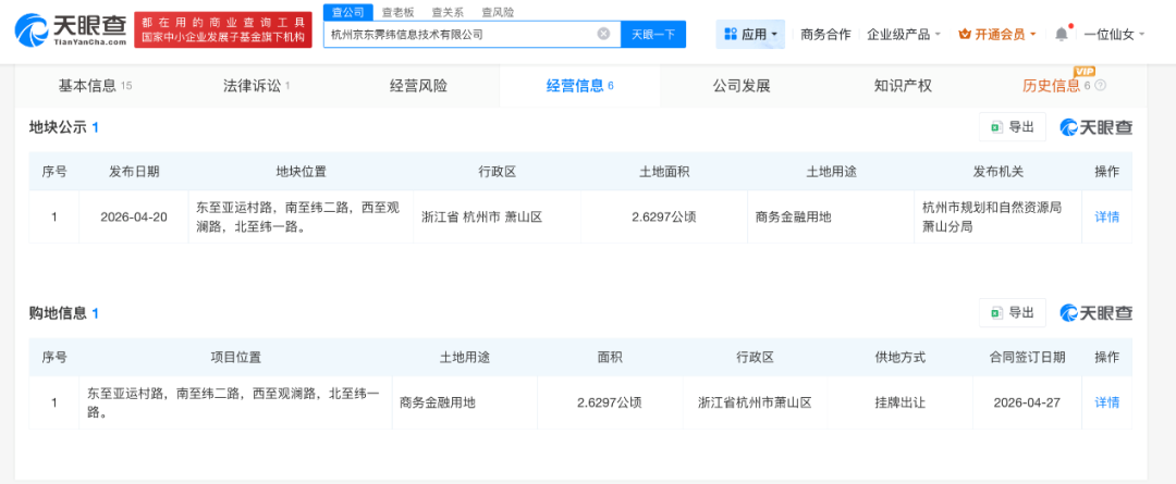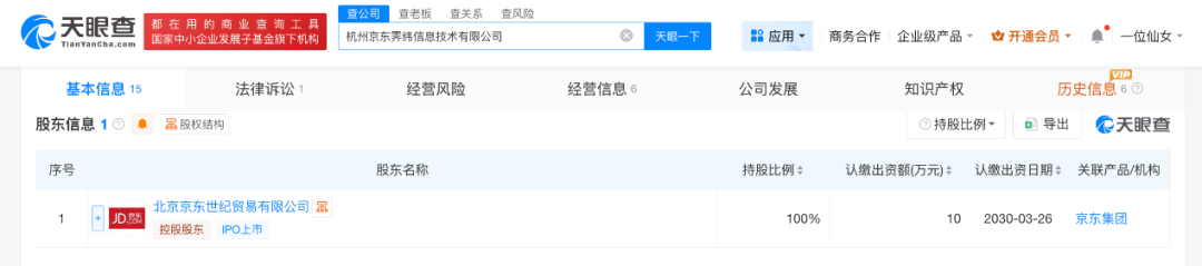 天眼查App显示,杭州京东霁纬信息技术有限公司成立于2025年4月,法定代表人为徐保乾,注册资本10万人民币,由北京京东世纪贸易有限公司全资持股。