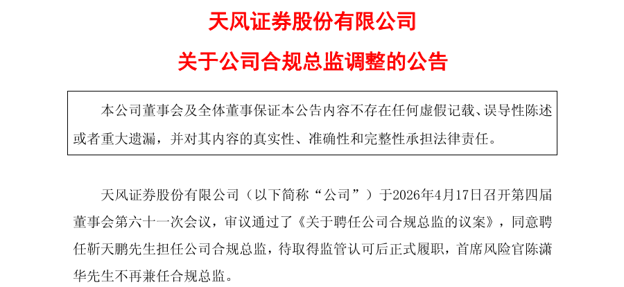4月17日,天风证券公告当日董事会会议同意聘任靳天鹏担任合规总监,待取得监管认可后正式履职,首席风险官陈潇华不再兼任合规总监。