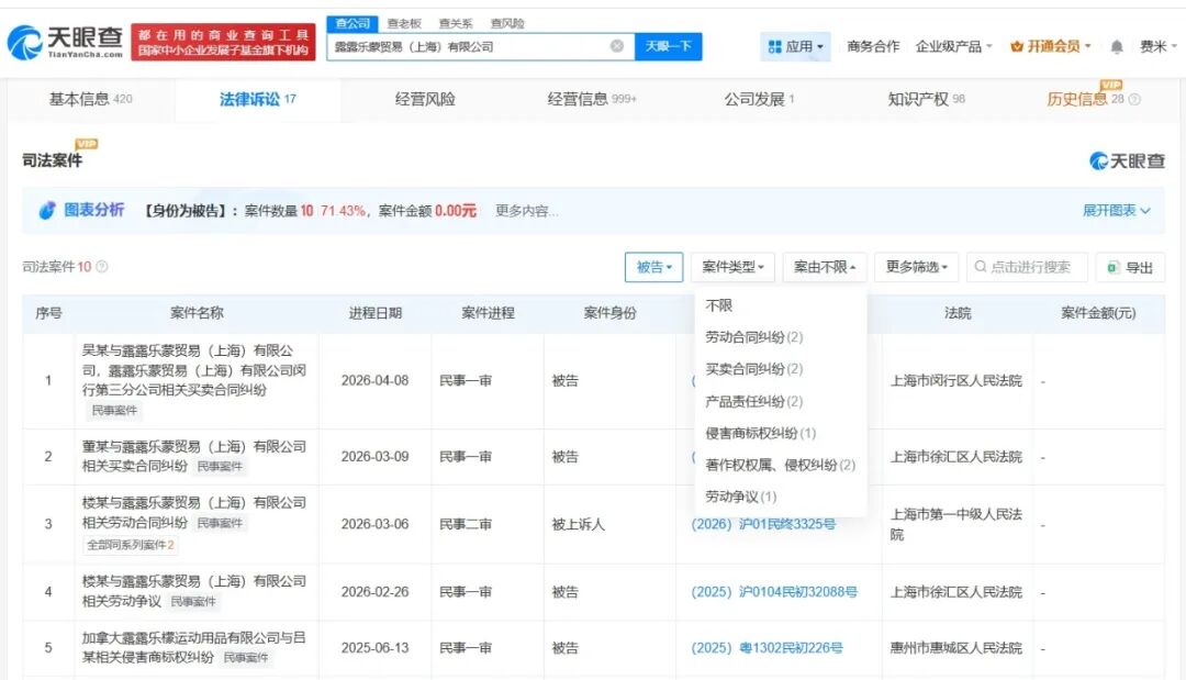 天眼查App显示,Lululemon中国关联公司露露乐蒙贸易(上海)有限公司成立于2013年5月,法定代表人为NG SAN YAN,注册资本1179.2万美元,经营范围包括食品销售、餐饮服务、企业总部管理等,由LULULEMON HK LTD.全资持股。风险信息显示,该公司曾涉及多起诉讼,案由涉及买卖合同纠纷、产品责任纠纷等。