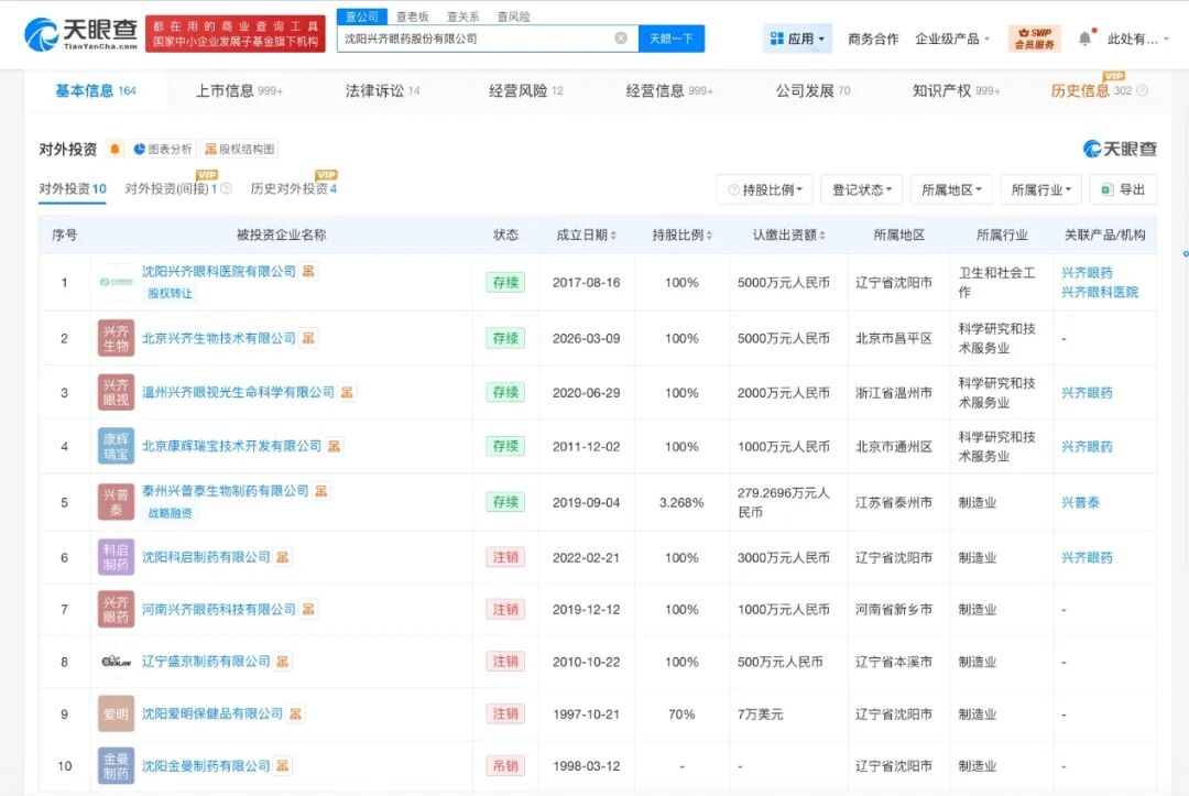 对外投资信息显示,该公司直接持股10家企业,其中5家为存续状态,包括沈阳兴齐眼科医院有限公司、北京兴齐生物技术有限公司、温州兴齐眼视光生命科学有限公司等。