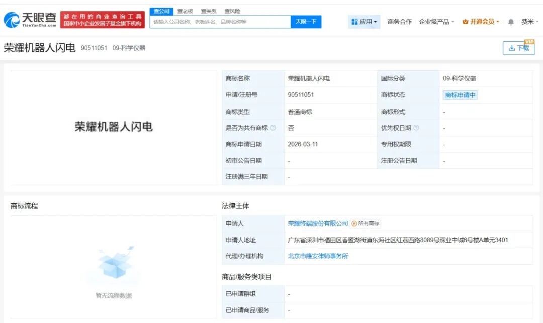 天眼查知识产权信息显示,近日,荣耀终端股份有限公司申请注册“荣耀机器人闪电”商标,国际分类为科学仪器,当前商标状态为等待实质审查。