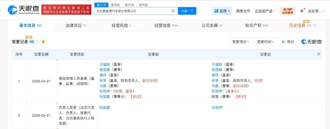 天眼查App显示,近日,北京新能源汽车股份有限公司发生工商变更,张国富卸任法定代表人、董事长,由刘观桥接任,同时,部分高管也发生变更。