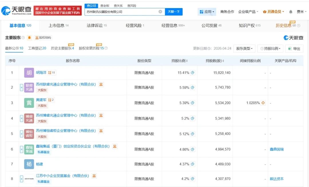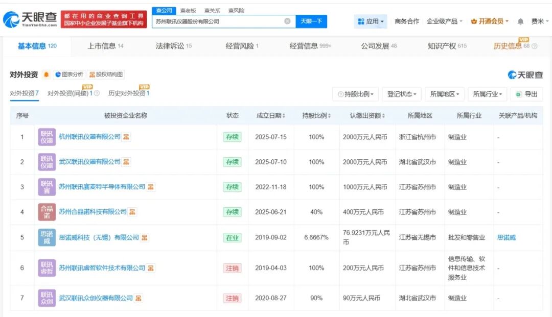 天眼查App显示,苏州联讯仪器股份有限公司成立于2017年3月,法定代表人为胡海洋,注册资本7700万人民币,经营范围包括仪器仪表制造、光学仪器制造、通信设备制造等,由胡海洋、苏州联睿光通企业管理中心(有限合伙)、黄建军等共同持股。对外投资信息显示,该公司对外投资7家企业,其中5家处于存续状态,包括杭州联讯仪器有限公司、武汉联讯仪器有限公司、苏州联讯赛麦特半导体有限公司等。