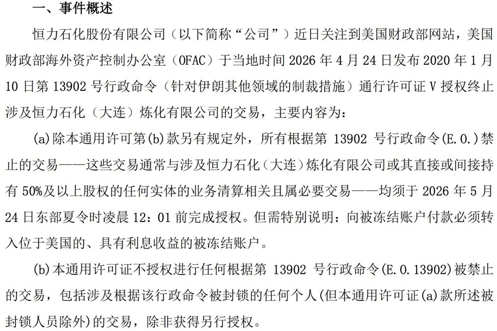 近日,恒力石化关注到,在当地时间2026年4月24日,美国财政部海外资产控制办公室(OFAC)发布2020年1月10日第13902号行政命令(针对伊朗其他领域的制裁措施)通行许可证V授权终止涉及恒力炼化的交易。