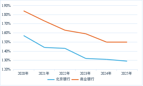 规模与结构的双优表现,为北京银行的经营发展奠定了坚实基础,而资产质量的持续向好,则成为其穿越周期、稳健经营的核心底气。近年来,该行始终将风险管控放在突出位置,不断完善风险防控体系,不良贷款率呈现稳步下行的清晰轨迹。2020年末至2025年末,北京银行年末不良贷款率分别为1.57%、1.44%、1.43%、1.32%、1.31%、1.29%,几年间不断下降。根据国家金融监督管理总局披露,同期商业银行不良贷款率依次为1.84%、1.73%、1.63%、1.59%、1.50%、1.50%,可见北京银行不良贷款率持续优于行业平均水平。