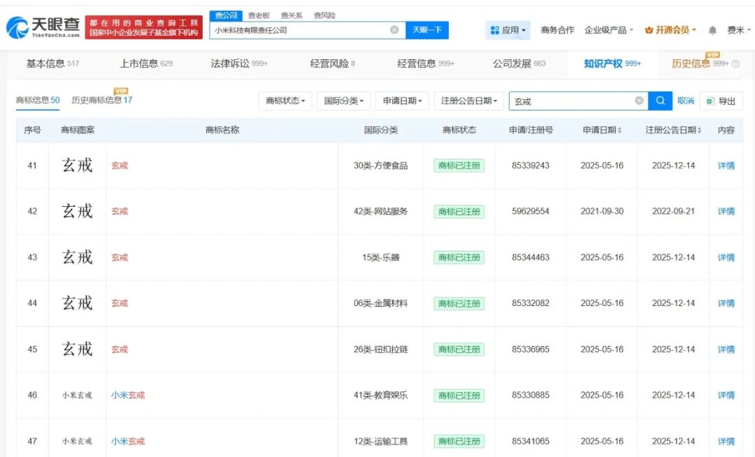 天眼查知识产权信息显示,小米科技有限责任公司已注册多枚“玄戒”“小米玄戒”“XRING O1”商标,国际分类包括医药、乐器、地毯席垫等。此外,北京玄戒技术有限公司登记了“Xiaomi XRING O1芯片视觉设计图”作品著作权,作品类别为美术。