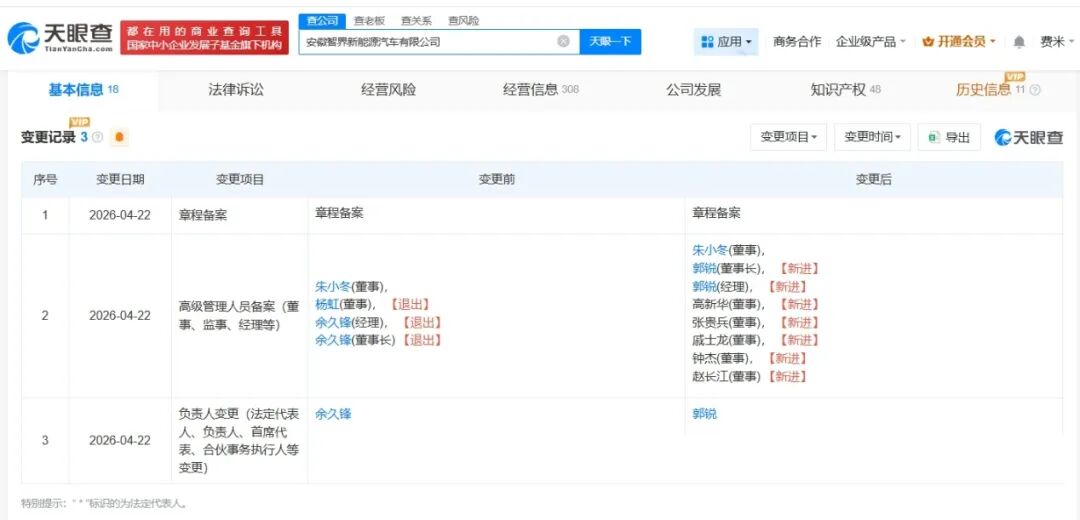天眼查App显示,近日,智界汽车关联公司安徽智界新能源汽车有限公司发生工商变更,余久锋卸任法定代表人、董事长、经理,由郭锐接任。