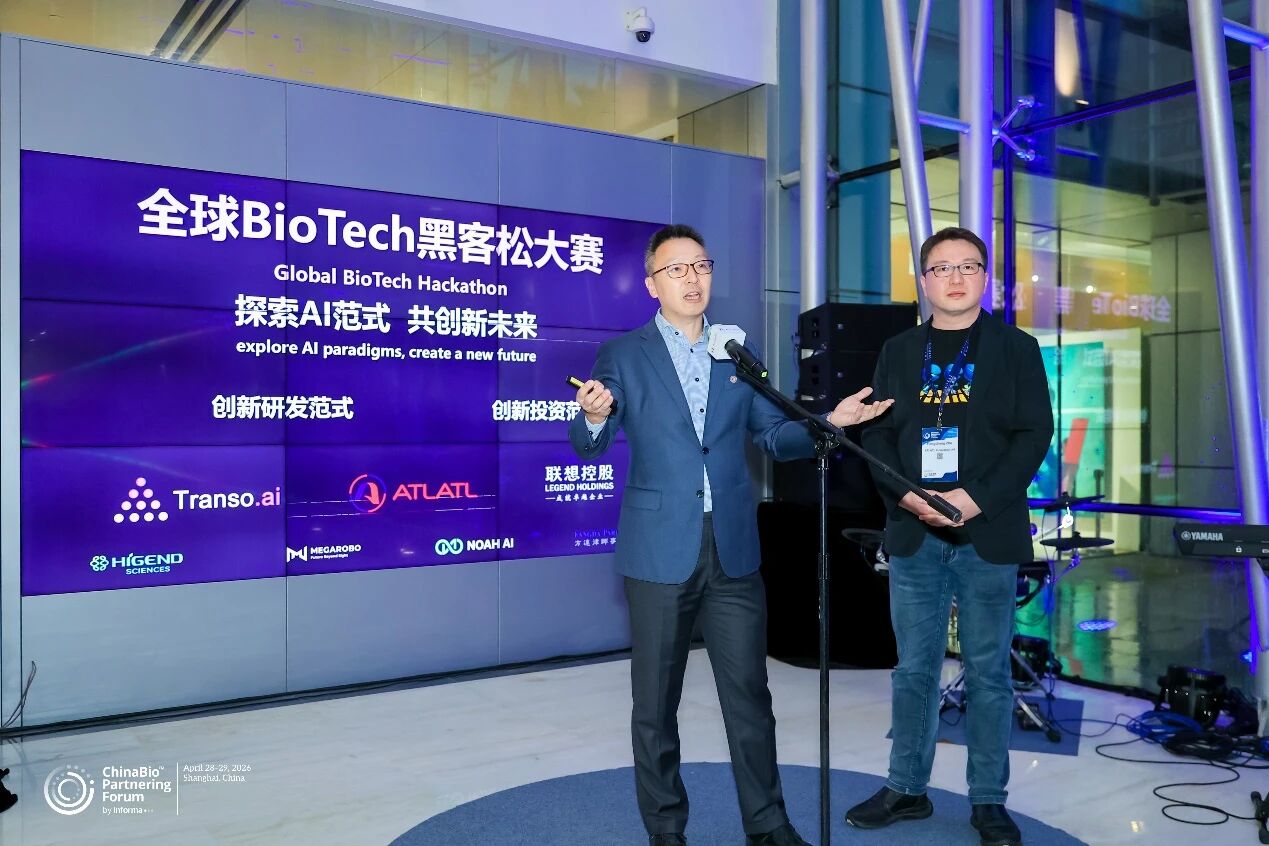 △联想控股助理总裁纪朝峰(左)与ATLATL创始人兼首席执行官朱鹏程(右)共同启动全球BioTech黑客松大赛