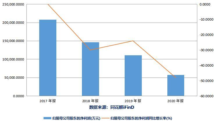 然而,金融业务却并没有给中天金融带来净利润的增长,近年来公司整体表现增收不增利。2017年至2020年,公司分别实现营业收入172.64亿元、181.88亿元、211.98亿元和234.37亿元;分别实现净利润20.82亿元、14.67亿元、11.08亿元、5.72亿元,呈逐年下降趋势。