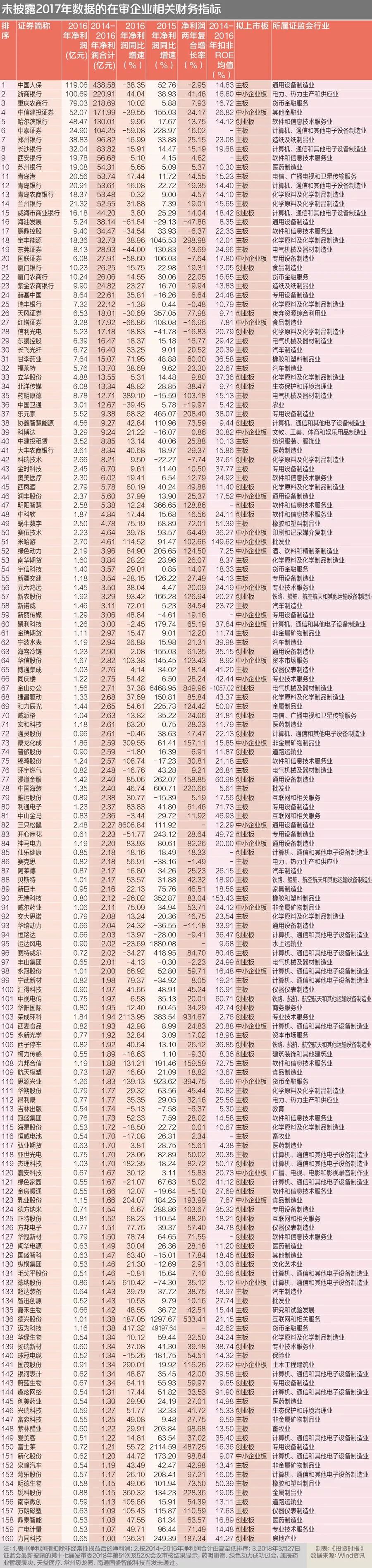 而在未披露2017年数据的160家企业中,2014-2016年净利润合计规模最大的是中国人保,高达438.58亿元;浙商银行、重庆农商行、中信建投证券、哈尔滨银行、中泰证券亦均在百亿元以上,此外郑州银行、长沙银行、西安银行、苏州银行、青岛港等30家企业亦均超过10亿元。可以看出,盈利规模排名前列的普遍为金融企业。