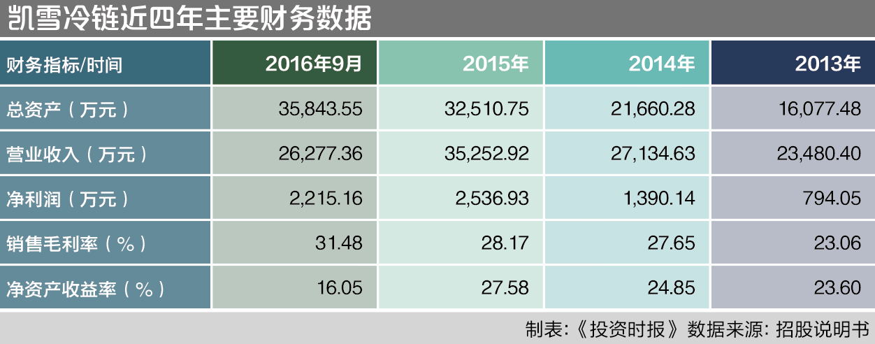 在资本的助力下,冷链行业站在了前所未有的风口上,主营商用展示柜和客车空调的凯雪冷链也顺势起飞。据招股书提示,该公司2013年至2015年及2016年前三季度(以下简称“报告期内”)营业收入分别为23480.40万元、27134.63万元、35252.92万元和26277.36万元,年均增长率达22%左右,而净利润分别为794.05万元、1390.14万元、2536.93万元和2215.16万元,更是平均每年接近翻倍。