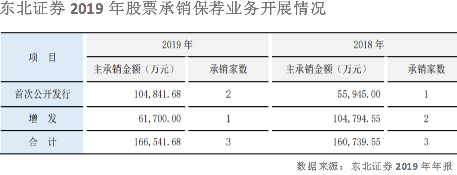东北证券净利润主要还是来源于证券投资业务和信用交易业务,营业利润率分别为93.67%和77.03%。投行业务方面,2019年,受科创板注册制改革等政策刺激,股权一级市场融资总规模增长,但科创板市场份额向头部券商集中趋势明显,中小券商项目承揽面临较大挑战。东北证券2019年仅完成3个保荐项目,总数和上一年持平。