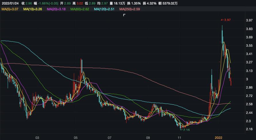 在二级市场,上述拟新设子公司、进军新能源行业公告后,该公司股价连收三个涨停板,但随后步入下行。截至2022年1月24日,该公司股价收盘于2.96元/股(不复权),公司总市值不足40亿元。