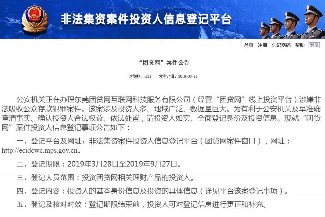 3月28日,东莞市公安局发布情况通报称,3月27日,东莞团贷网互联网科技服务有限公司(下称团贷网)实际控制人唐某、张某主动向东莞市公安局投案。东莞市公安局已对“团贷网”涉嫌非法吸收公众存款案立案侦查,并依法对团贷网实际控制人唐某、张某采取刑事强制措施。目前,案件正在依法侦办中。